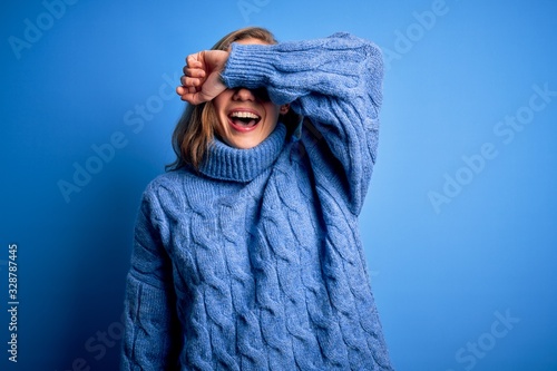 © Krakenimages.com, Obraz premium Young beautiful blonde woman wearing casual turtleneck sweater over blue background covering eyes with arm smiling cheerful and funny. Blind concept.