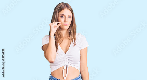 Fototapeta premium Young beautiful blonde woman wearing casual white tshirt mouth and lips shut...