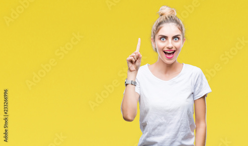 © Krakenimages.com, Fototapeta premium Young beautiful blonde woman wearing white t-shirt over isolated background pointing finger up with successful idea. Exited and happy. Number one.