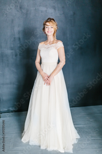 Fototapeta premium Young beautiful bride with a beautiful diadem in the hair poses sitting on...