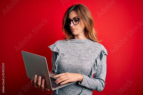 © Krakenimages.com, Naklejka premium Young beautiful brunette businesswoman wearing glasses using laptop over red background with a confident expression on smart face thinking serious