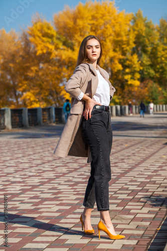 Fototapeta premium young beautiful brunette girl in beige coat and black jeans