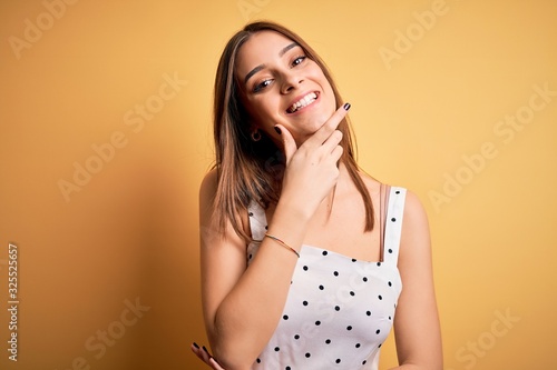 Fototapeta premium Young beautiful brunette woman wearing casual dress standing over yellow...