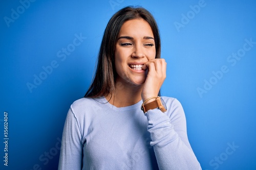 © Krakenimages.com, Fototapeta premium Young beautiful brunette woman wearing casual sweater standing over blue background looking stressed and nervous with hands on mouth biting nails. Anxiety problem.