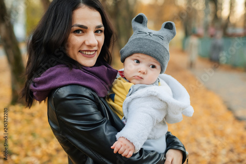 Fototapeta premium young beautiful Caucasian girl mom holding her little boy baby son