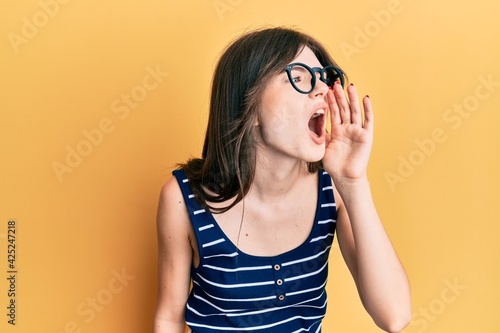 © Krakenimages.com, Fototapeta premium Young beautiful caucasian girl wearing casual clothes and glasses shouting and screaming loud to side with hand on mouth. communication concept.