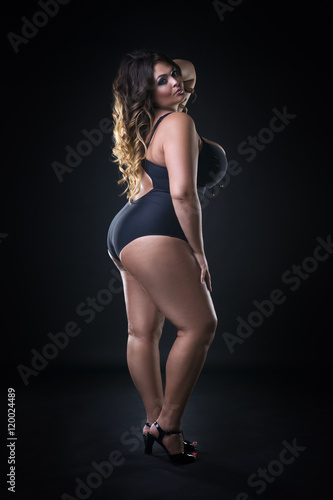Obraz premium Young beautiful caucasian plus size model in swimsuit, xxl woman on black...