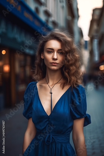 Fototapeta premium young beautiful caucasian woman in blue dress walking in city center. AI...