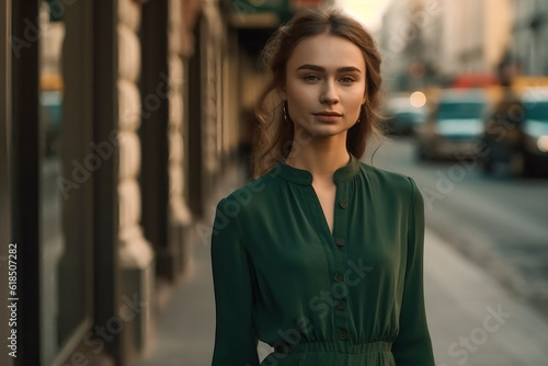 © EwaStudio, Fototapeta premium young beautiful caucasian woman in green dress walking in city center. AI Generated
