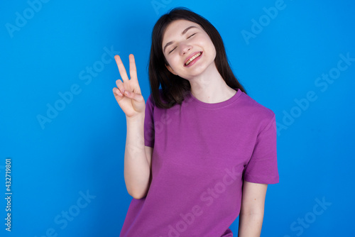 © Roquillo, Fototapeta premium young beautiful Caucasian woman wearing purple T-shirt over blue wall smiling with happy face winking at the camera doing victory sign. Number two.