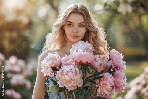 © Dina, Obraz premium young beautiful caucasian woman with peonies bouquet in casual clothes in summer park