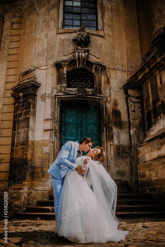 © Yuliia, Naklejka premium Young beautiful couple bride and groom kisses each others on the background of the church