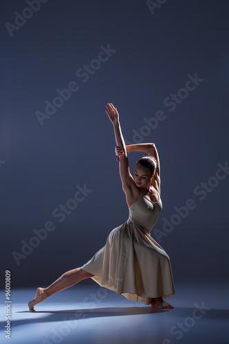 © master1305, Fototapeta premium Young beautiful dancer in beige dress dancing on gray background
