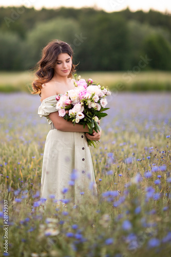 © Elena, Fototapeta premium Young beautiful dark-haired girl with a bouquet of Peonies in a field of cornflowers. Summer.Cereals and field dawns. Life in the village.
