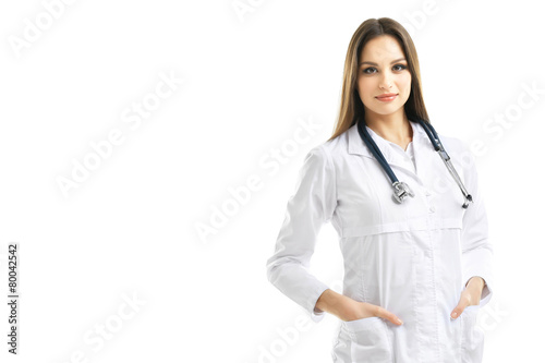 © Africa Studio, Fototapeta premium Young beautiful doctor isolated on white