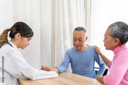 © pixs4u, Fototapeta premium Young beautiful doctor taking senior patients pulse