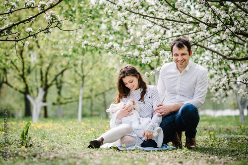 Obraz premium Young beautiful family with baby child hugging each other in blossoming...