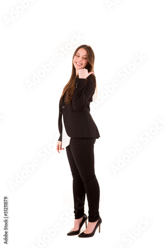 Fototapeta premium Young beautiful female business executive pointing at copyspace