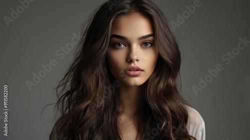 © Hashim, Fototapeta premium Young beautiful female fashion model with dark long wavy hair looking at camera