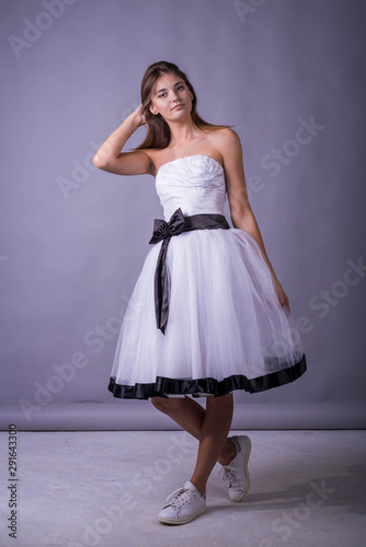 © mihakonceptcorn, Naklejka premium Young beautiful female model in white dress on gray background.