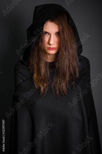 Fototapeta premium Young, beautiful girl in a black cloak with a hood in the studio on a gray...
