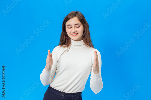 Fototapeta premium Young beautiful girl isolated on blue background