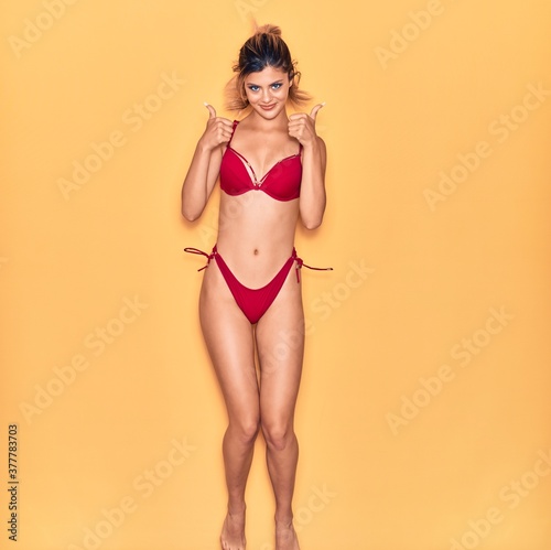 © Krakenimages.com, Obraz premium Young beautiful girl on vacation wearing bikini smiling happy. Jumping with smile on face doing ok sign with thumbs up over isolated yellow background