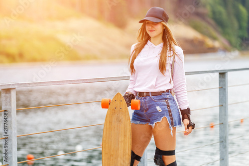 © skumer, Obraz premium Young beautiful girl standing with longboard near the mountain lake beach