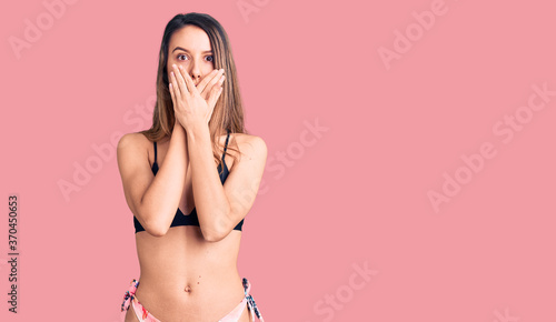 Fototapeta premium Young beautiful girl wearing bikini shocked covering mouth with hands for mistake. secret concept.