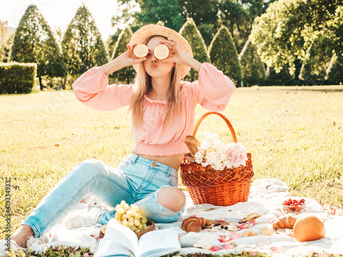 © halayalex, Obraz premium Young beautiful hipster woman in trendy summer jeans, pink T-shirt and hat. Woman making picnic outside. Positive model sitting on plaid on grass, eating fruits and cheese, holding lemons in hands