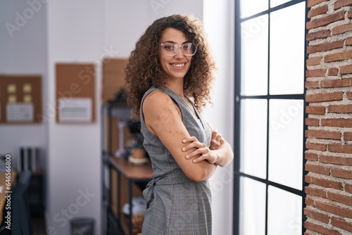Fototapeta premium Young beautiful hispanic woman business worker smiling confident standing with arms crossed gesture at office