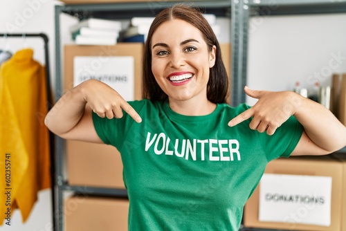 Obraz premium Young beautiful hispanic woman smiling confident pointing with fingers to volunteer t shirt at charity center