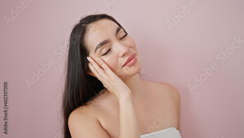 © Krakenimages.com, Fototapeta premium Young beautiful hispanic woman smiling confident touching face over isolated pink background