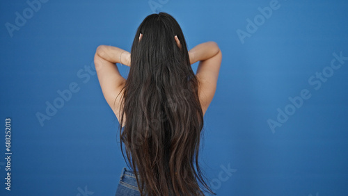 Obraz premium Young beautiful hispanic woman touching her hair backwards over isolated blue...