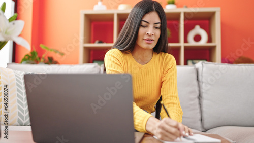 Naklejka premium Young beautiful hispanic woman using laptop writing on notebook at home