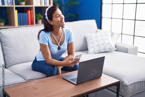 Obraz premium Young beautiful hispanic woman using smartphone and laptop at home