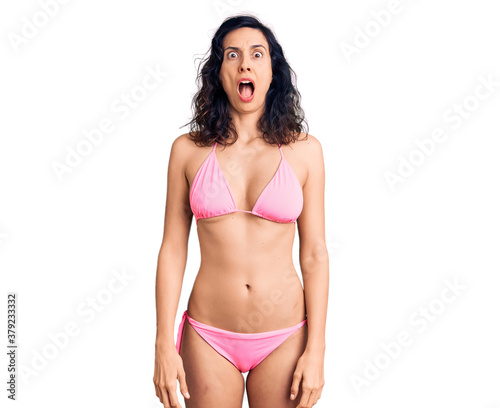 © Krakenimages.com, Fototapeta premium Young beautiful hispanic woman wearing bikini afraid and shocked with surprise and amazed expression, fear and excited face.