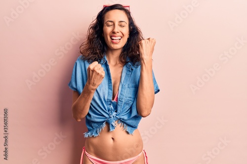 Fototapeta premium Young beautiful hispanic woman wearing bikini and shirt celebrating surprised and amazed for success with arms raised and eyes closed