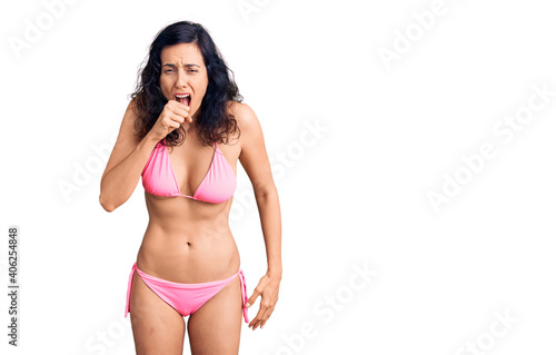 Naklejka premium Young beautiful hispanic woman wearing bikini feeling unwell and coughing as...