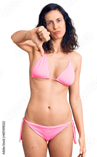 Fototapeta premium Young beautiful hispanic woman wearing bikini looking unhappy and angry showing rejection and negative with thumbs down gesture. bad expression.