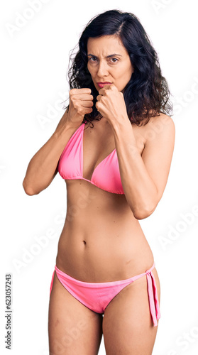 Naklejka premium Young beautiful hispanic woman wearing bikini ready to fight with fist defense gesture, angry and upset face, afraid of problem