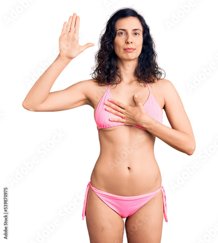 Fototapeta premium Young beautiful hispanic woman wearing bikini swearing with hand on chest and open palm, making a loyalty promise oath