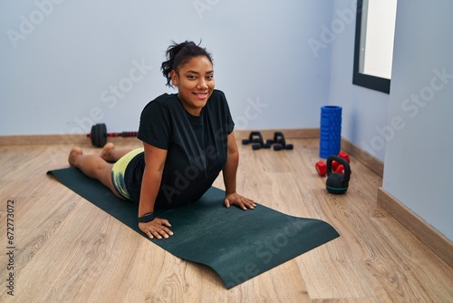 Fototapeta premium Young beautiful latin woman smiling confident stretching back at sport center