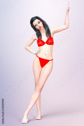 Obraz premium Young beautiful sexy girl in red lingerie. Woman standing in full body in candid provocative pose. Conceptual fashion art. Isolate. Studio, high key. Photorealistic 3D rendering illustration.