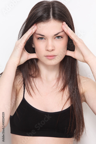 © Olga Ekaterincheva, Obraz premium Young beautiful slim girl with headache expression