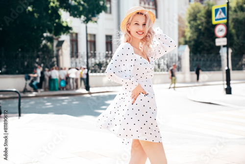 Naklejka premium Young beautiful smiling blond woman in trendy summer white dress. Sexy carefree woman posing in street at sunset. Positive model outdoors at sunny day. Cheerful and happy. In hat
