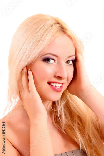 © Africa Studio, Fototapeta premium Young beautiful smiling blond woman touching her face isolated o