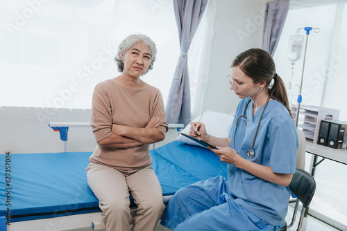 © Witoon, Fototapeta premium Young beautiful smiling doctor nurse caring to help happy senior grandmother helping old patients in rehabilitation at elderly health checkup