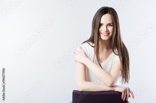 Fototapeta premium Young beautiful smiling woman with long straight hair on a gray.