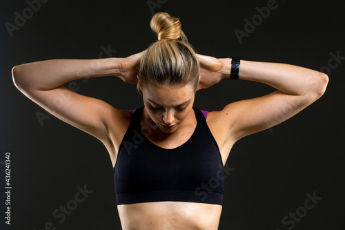 Obraz premium Young beautiful sport woman at studio on black background